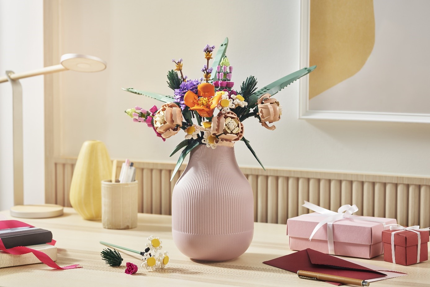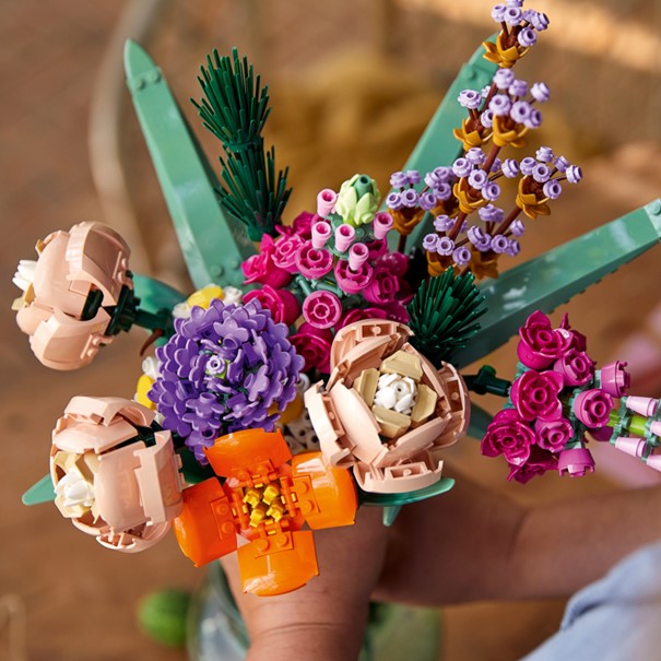A virágcsokor különösen jól kombinálható különböző vázákkal, így hiába ugyanaz a LEGO modell, mindig meg tud picit újulni attól függően, hogy milyen kiegészítőt választunk mellé.