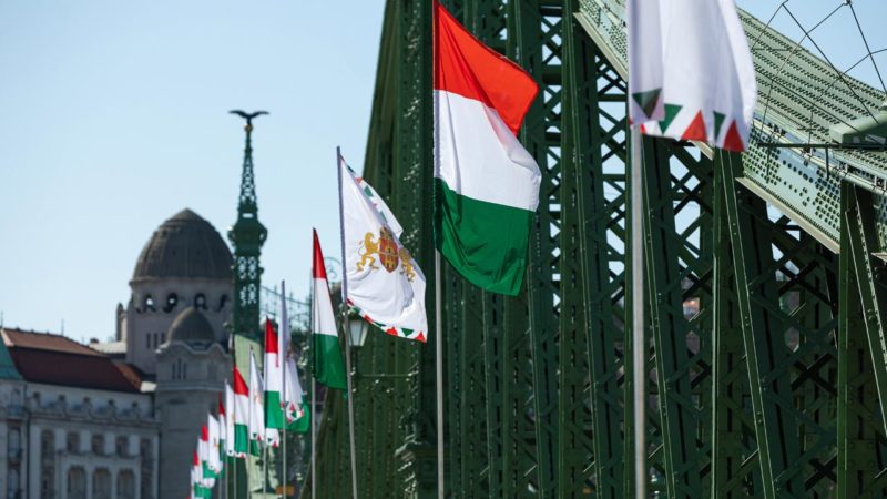 A fellobogózott Szabadság híd 2020. március 15-én – Fotó: MTI/Mohai Balázs
