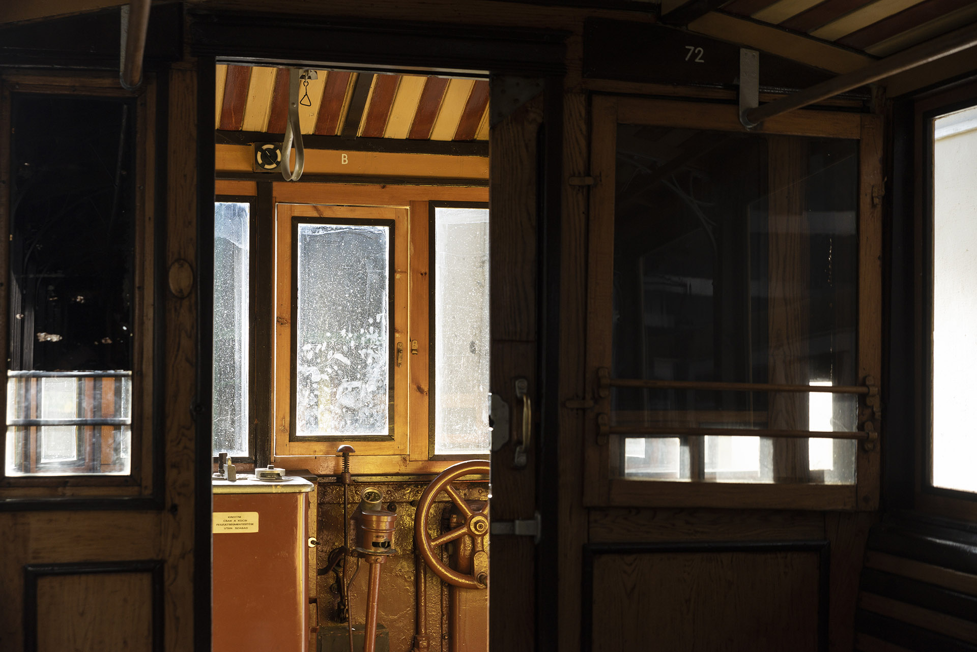 Múltidéző egotripem után felmászom egy másik, jóval régebbi járgányra, amit akkor gyártottak, amikor dédszüleim is csupán csattogós falepkét tologattak a játszótéren. Az 1897-ben, jóval a műanyag korszak beköszönte előtt, a Schlick cég által gyártott villamos csupa fa, réz és vas, van benne anyag rendesen, és elámulok amikor Laci bácsi mosolyogva bemondja, hogy a lakktól csillogó, egészen újszerűnek ható ülésdeszkák eredeti darabok.