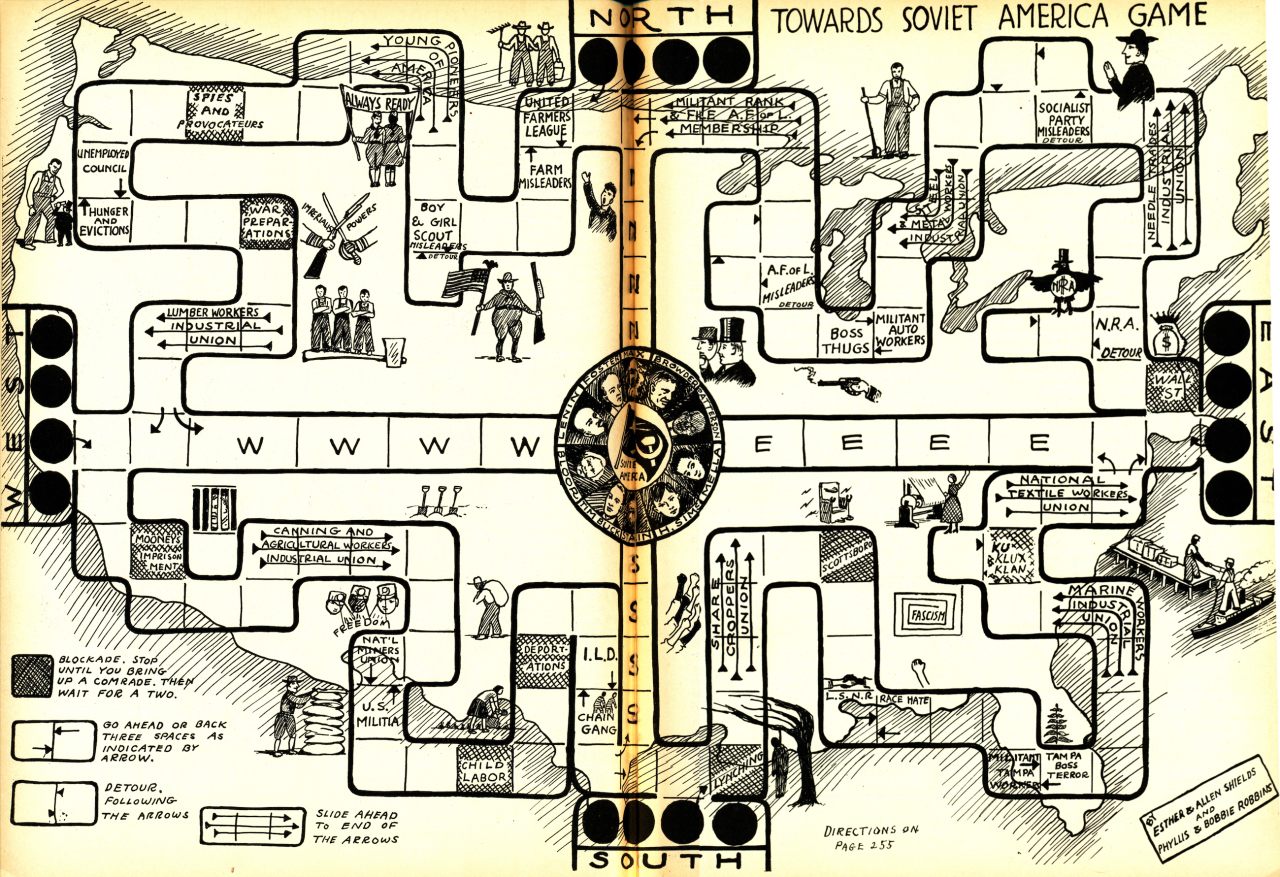A játék címe Towards Soviet America (a Szovjet Amerika felé) volt, és – ez aligha meglepő – nem lett túlságosan sikeres. Ám a keletkezéstörténete kifejezetten érdekes. Az 1930-as évek nem csak a társasjátékok, hanem az amerikai kommunizmus aranykora is volt. Az Egyesült Államok még nem állt hidegháborús viszonyban a Szovjetunióval, az USA kommunista pártja, a CPUSA pedig egy hamarosan bekövetkező, globális proletárforradalomról álmodozott. A gazdasági világválság egyébként nagyon is kedvezett a CPUSA-nak; 1932-ben William Zebulon Foster, a CPUSA főtitkára több mint 100 000 szavazatot kapott az elnökválasztáson, többet mint bármelyik kommunista jelölt korábban vagy azóta (persze, ez így is csak 0,3 százaléka volt az összes szavazatnak).