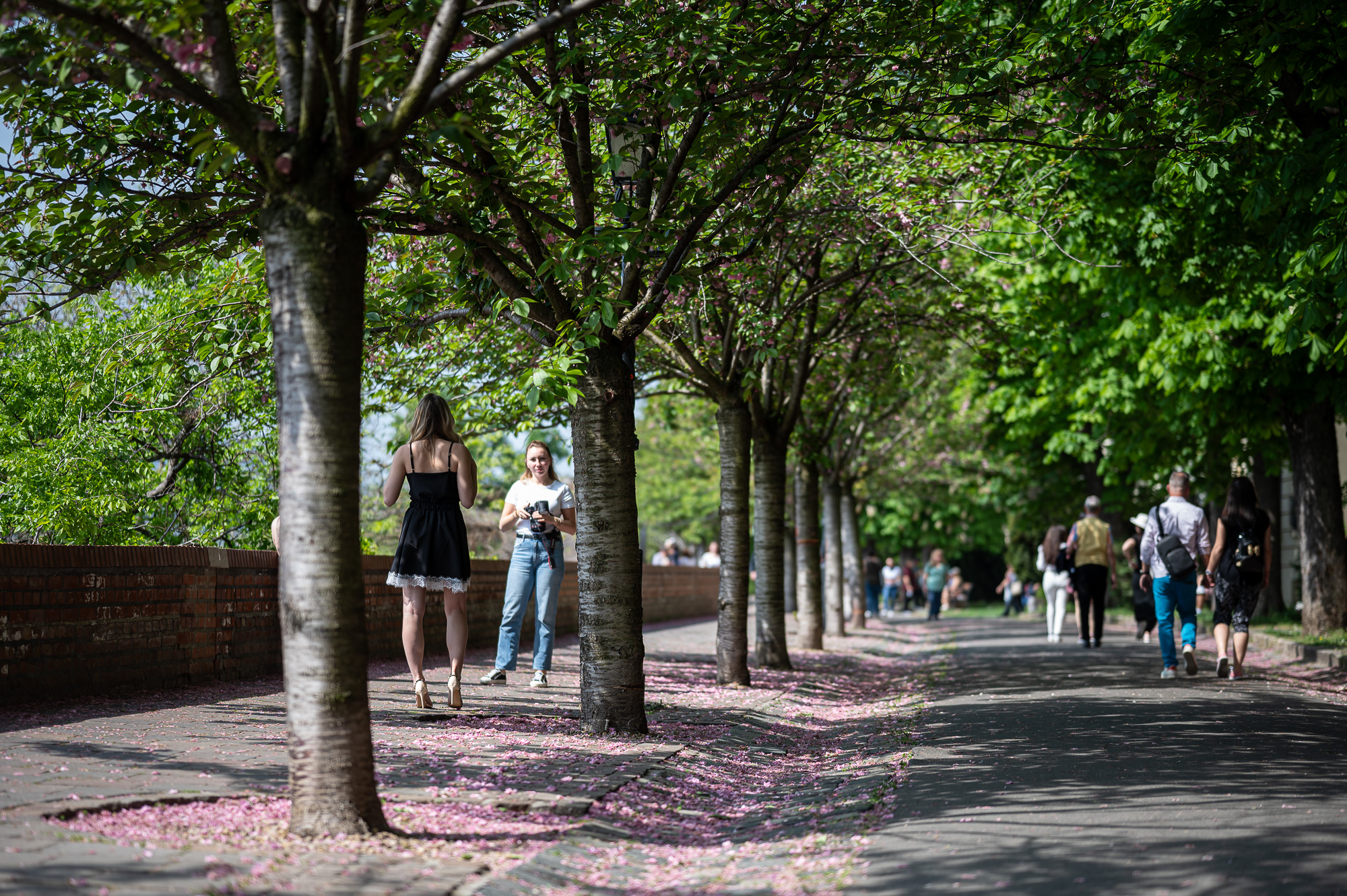 Én tényleg csak a Tóth Árpád sétány virágait – na jó, a köztük szelfiző turistákat – szerettem volna körbefotózni április közepén; köztudomásulag ekkor nyílnak ugyanis a legendás, minden létező budapesti turistakalauzban is szereplő cseresznyefák. Magabiztosan rákanyarodtam a Dísz térről, fényképező a kézben… hogy azonnal leessen, hogy a virágok sehol sincsenek, pontosabban ott vannak, csak éppen nem a fákon.