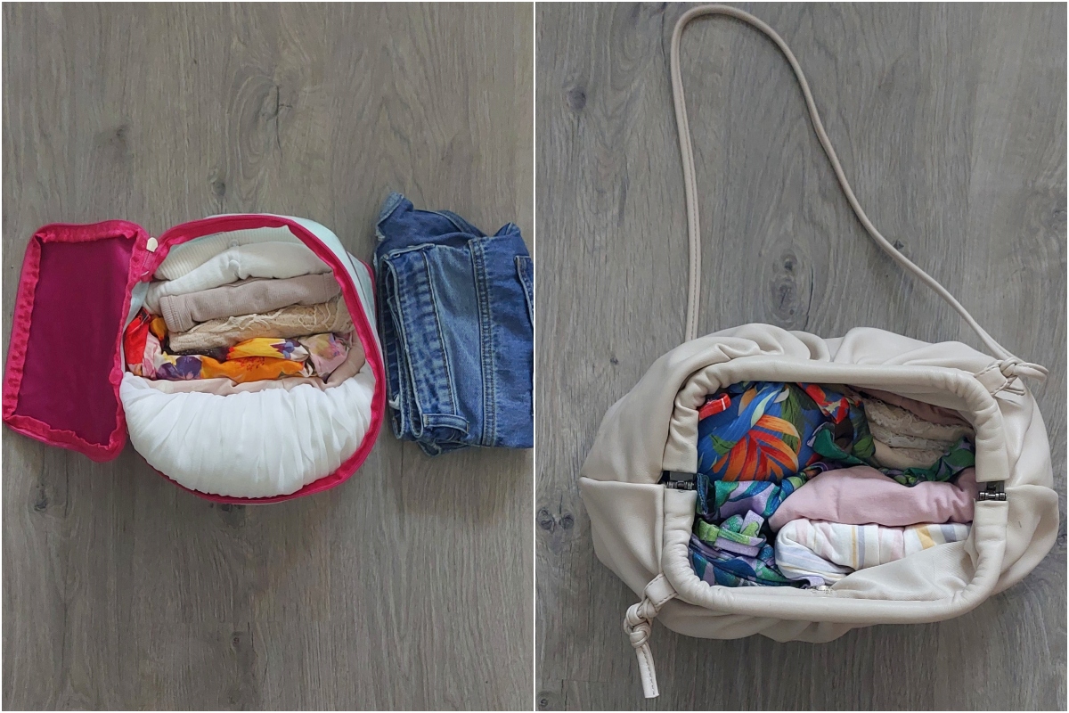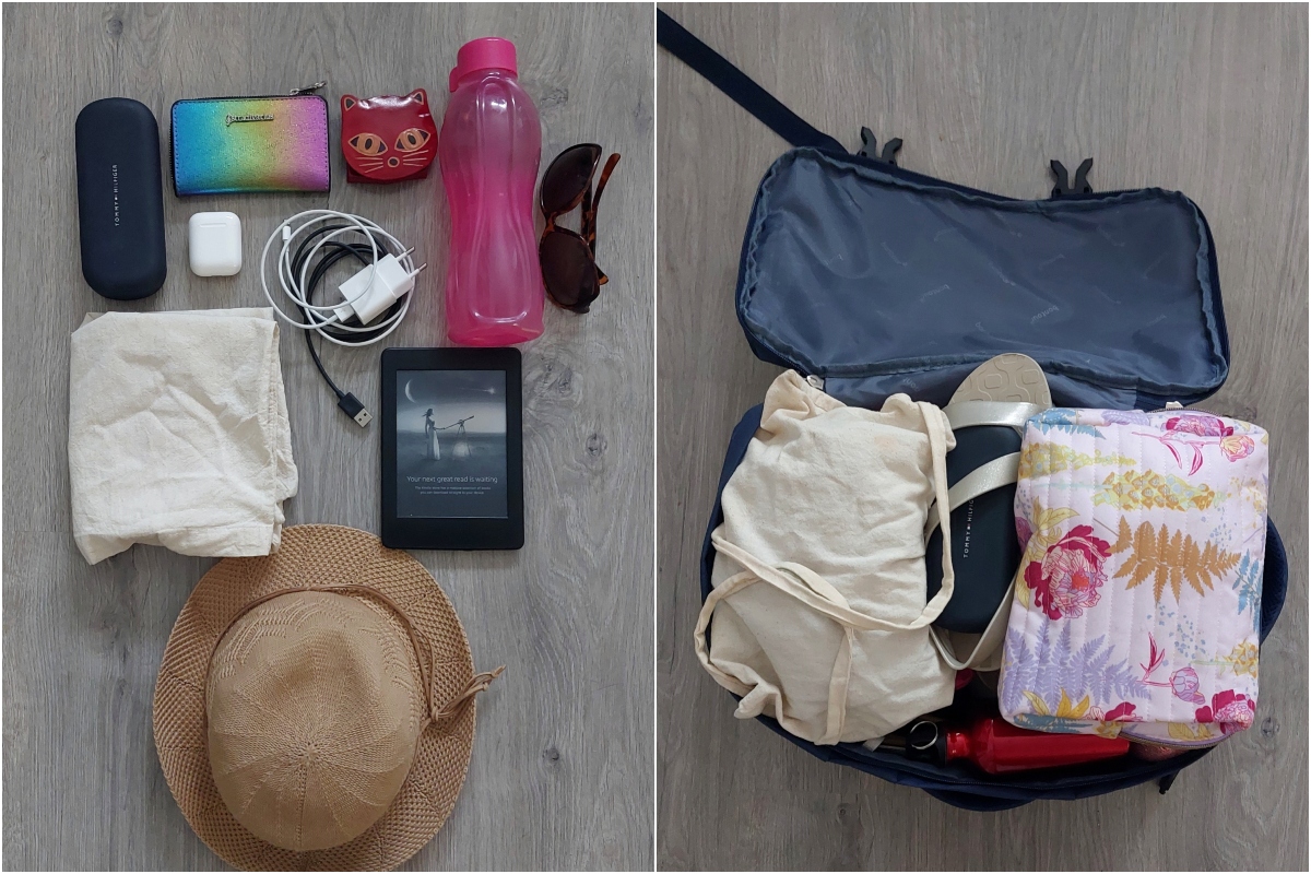 A retikülbe, amit az útra szántam (és amibe egyébként még a kulacsom is befér, ez fontos szempont) tettem a fürdőruhákat és a pizsamát, illetve a fehérneműk is ide kerültek a helykihasználás érdekében. A strandruhát pedig egy vászontáskába tettem – utóbbi tök jól funkcionál strand- és bevásárlótáska gyanánt, ha arra van szükség, ezért nálam mindig van egy.