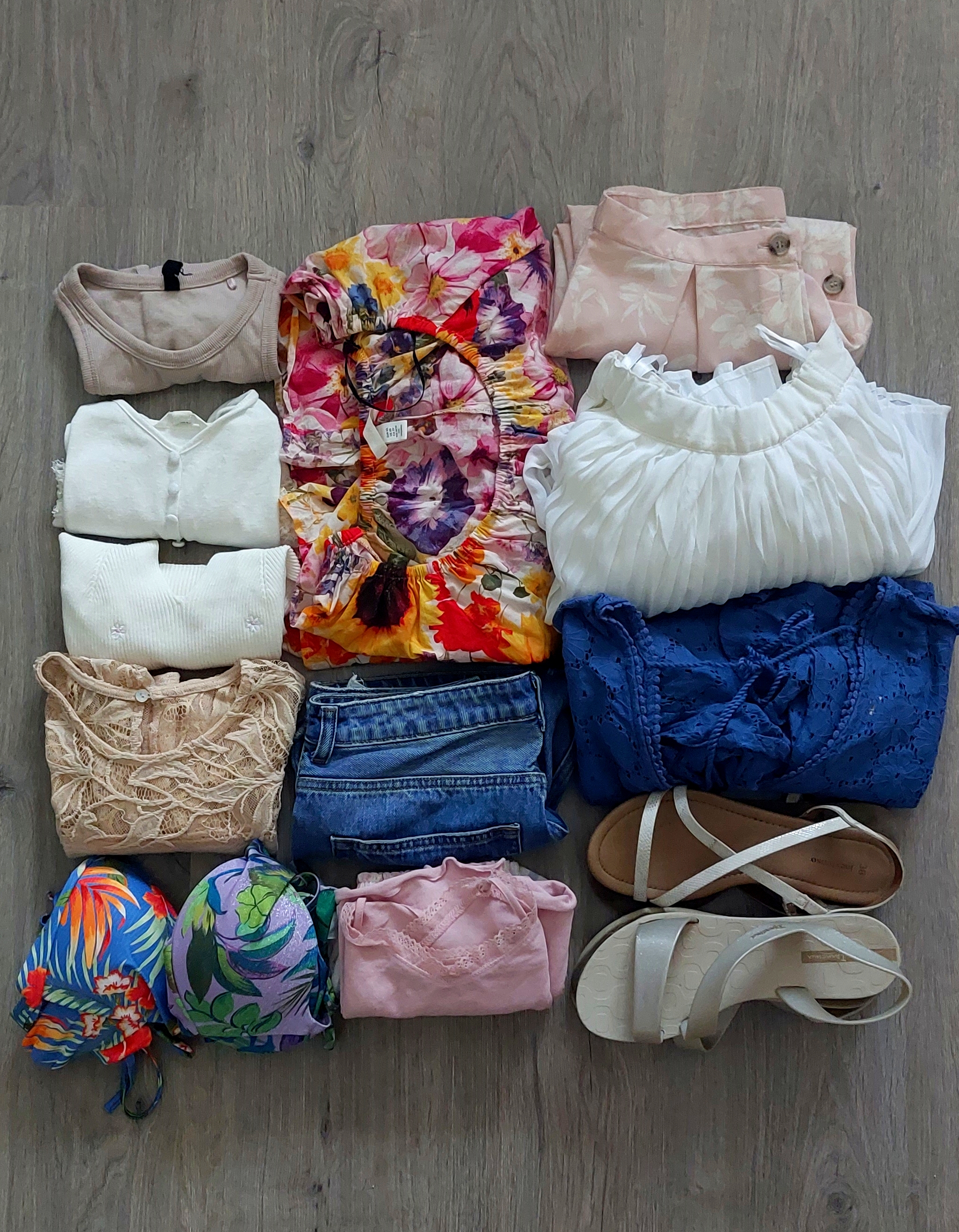 Négy felső, két szoknya, egy rövidnadrág, egy hosszú ruha – ez adta az alapot. Színek tekintetében az volt az elképzelés, hogy inkább világosabb darabok domináljanak a meleg miatt. Kapott még szerepet két szandál – ebből az egyik műanyag, így zuhanyzóban is használható, de a tengerpartra is tökéletes választás a vastag talpa miatt –, két fürdőruha – hogy legyen váltás –, egy strandruha – mert mégsem illik a büfében bikiniben beülni – és a pizsama.