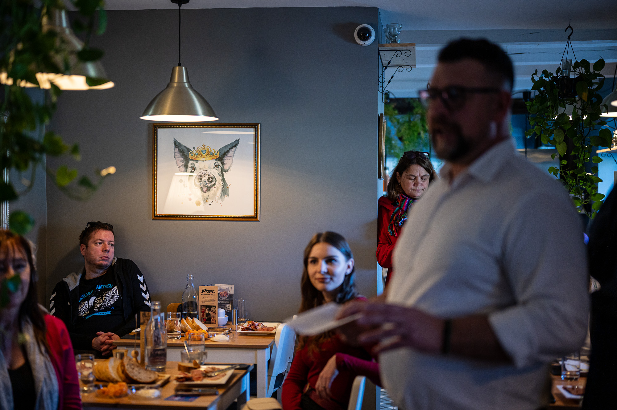 Balatonkenese generációkon átívelő büszkesége ez a malacorientált reggelizőhely és csemegebolt. Itt kezdtük a programot, azaz mindenki éhes volt, na nem mintha csak emiatt szerettük volna felvásárolni az egész készletet, mindenestül, de végül rávetettük magunkat a tökéletesen komponált válogatásokra, amelyeket látva valahogy senki nem jelentkezett, hogy „bocsánat, én nem eszem húst”. Az asztalok körüli párbeszédekből kiderült azonban, hogy az igazi hasadás a nemzet testén nem mindenféle ideológiák és politikai pártok, hanem a pörc szó értelmezésén van, ez ugyanis régiónként eltér, és ahogy a Pörcben (mármint a bisztróban) gondolnak a műfajra, az jóval összetettebb, mint a hagyományos tepertőszinonima.