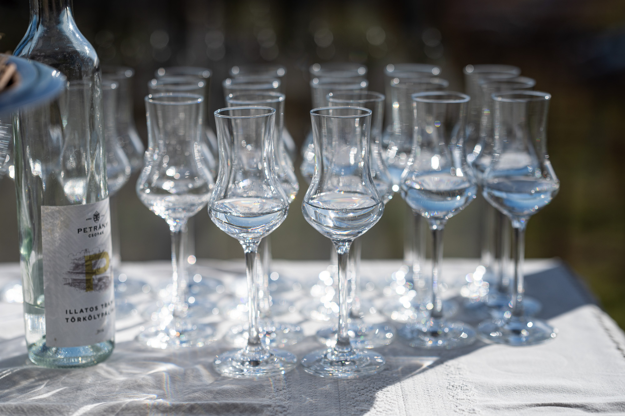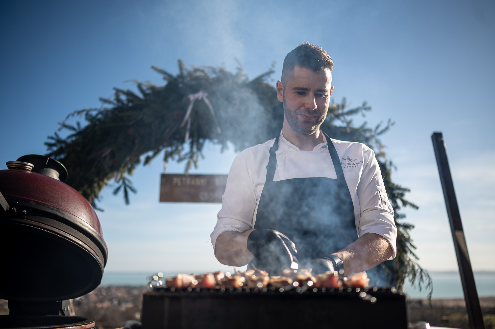 A balatonszemesi étterem és szálló (ahol szobát már csak a reggeli miatt is megéri foglalni, pontosabban a svédasztalon diszkréten megbúvó sós kiflik miatt) nem véletlenül kész intézmény, és az sem véletlen, hogy a tulajdonosa, Csapody Balázs a Taste Balaton egyik megálmodója. Amikor odaérkezünk, Pach Gábor pálinkamester várt minket, fél (aztán mindkét) lába mobil pálinkafőzőjén, ez Magyarországon az egyetlen. Mivel nagyvonalúan kóstoltatott, miközben a működését ecsetelte, a részleteket most át is kell ugornunk, a lényeg, hogy férfit így tárgyra ennyire büszkének még sosem láttunk. Ha jól emlékszünk, az étel is fantasztikus volt, valami húsgolyós vadas lehetett. Hogy mentsük a menthetőt, idézzük inkább a szervezőket.