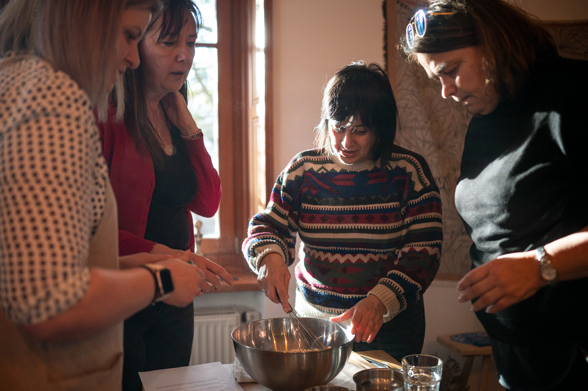 Ezt a dörgicsei lakáséttermet már csak a kertje miatt is érdemes meglátogatni, ilyen nyugalmat rég éreztünk. Nem mintha bent feszült lenne a hangulat, igaz, megdolgoztat mindenkit Reiner Viktor veterán séf és párja (ez visszatérő motívum a Balaton-menti gasztroforradalomban), Ferencz Nikoletta. Ők ugyanis egy két helyi lány által üzemeltetett elviteles cukrászda, a Rád is süt közreműködésével prezentálják a financierkészítő workshopot; ez egy pofonegyszerűen, de szórakoztatóan elkészíthető francia süti, amit a békeidőben nagyon szerettek a tőzsdecápák, mert zsebre lehetett tenni anélkül, hogy szétesett volna.