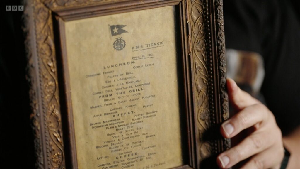 A Titanic utolsó estéjén felszolgált első osztályú vacsoramenü szintén egy egészen különleges ereklye. Francia nyelven nyomtatták, ahogy az akkoriban szokás volt a nemzetközi luxushajókon. Az étlap tükrözi a korszak ízlésvilágát. 2015-ben több mint 88 ezer fontért (azaz 40 millió forintért) kelt el egy árverésen.