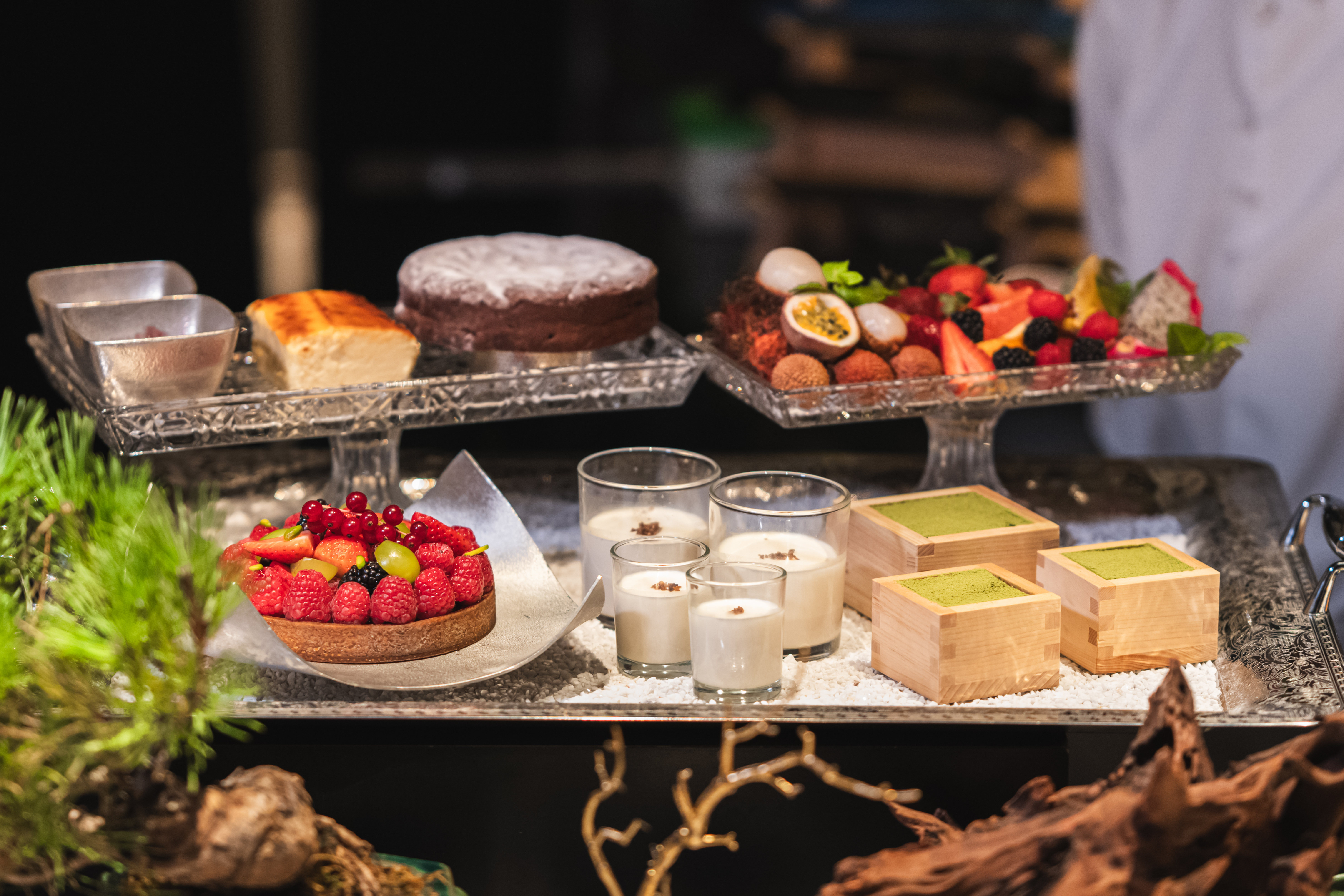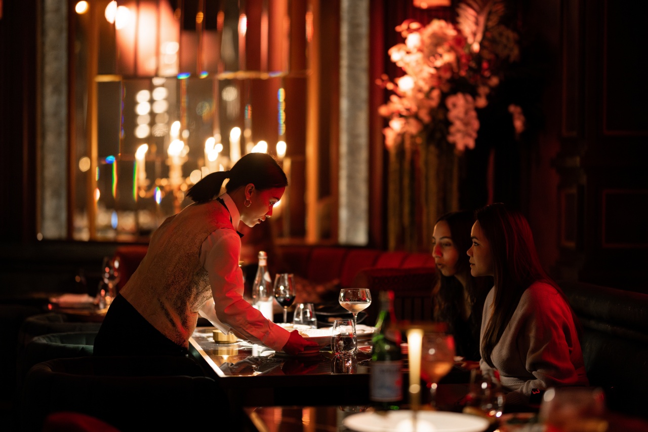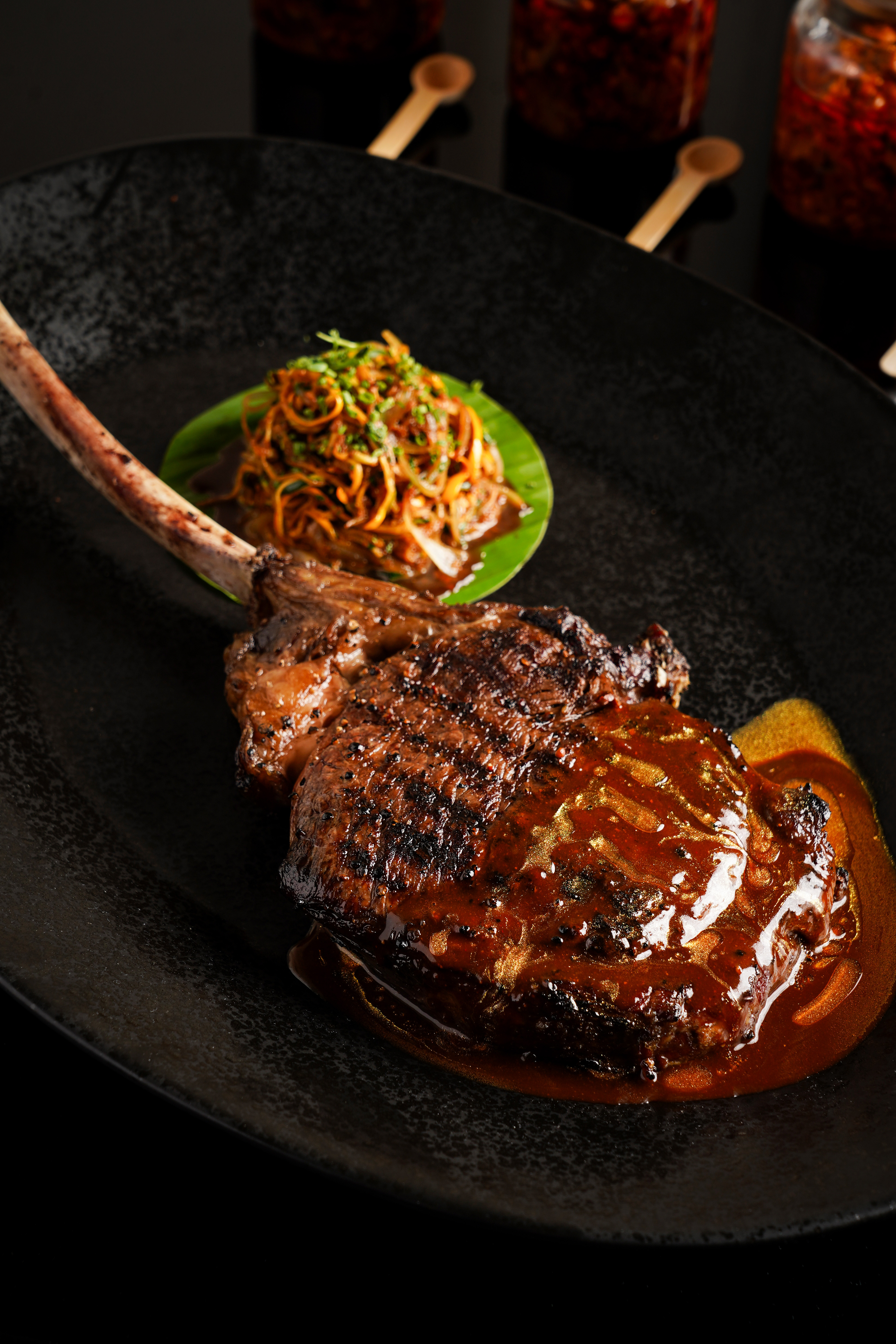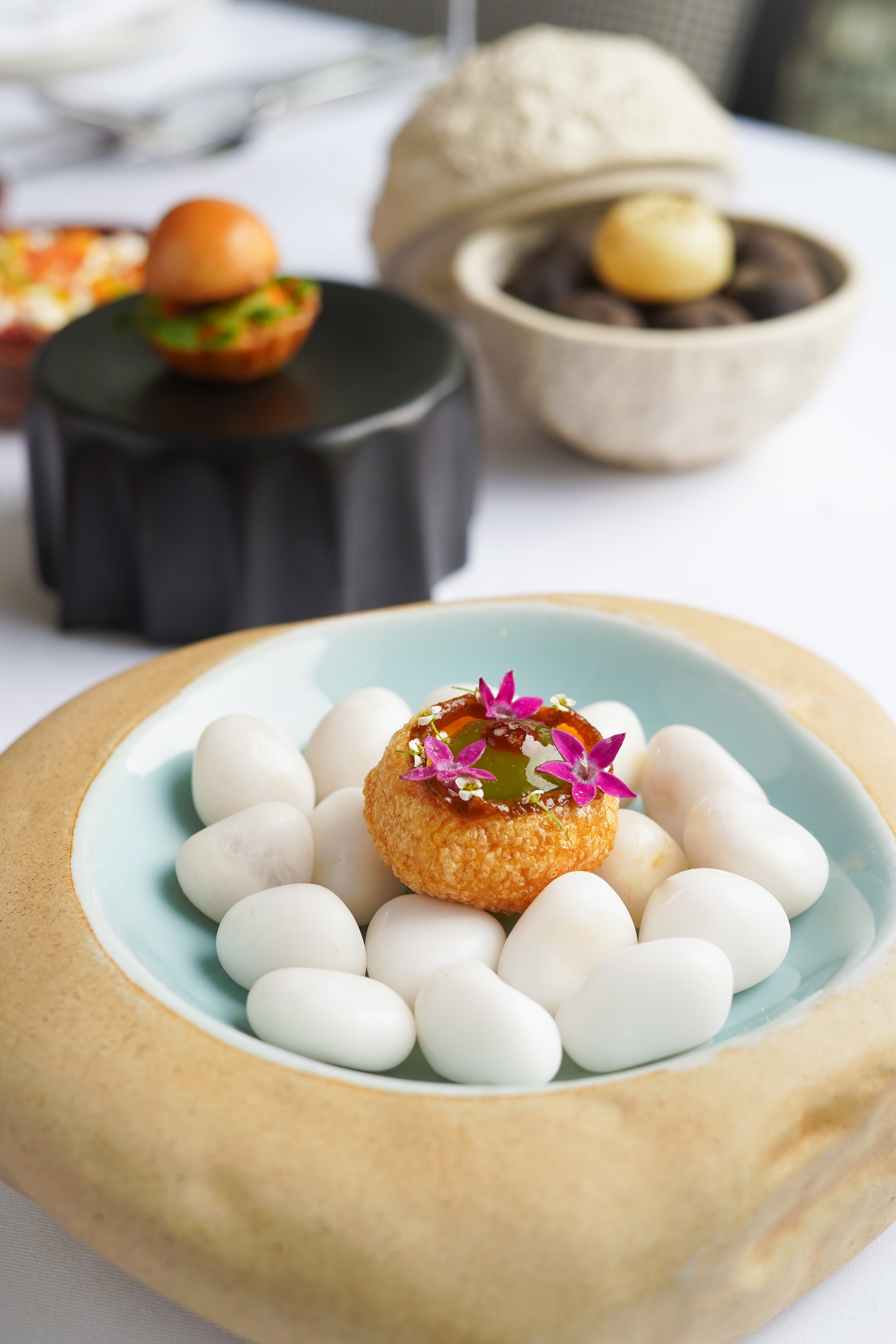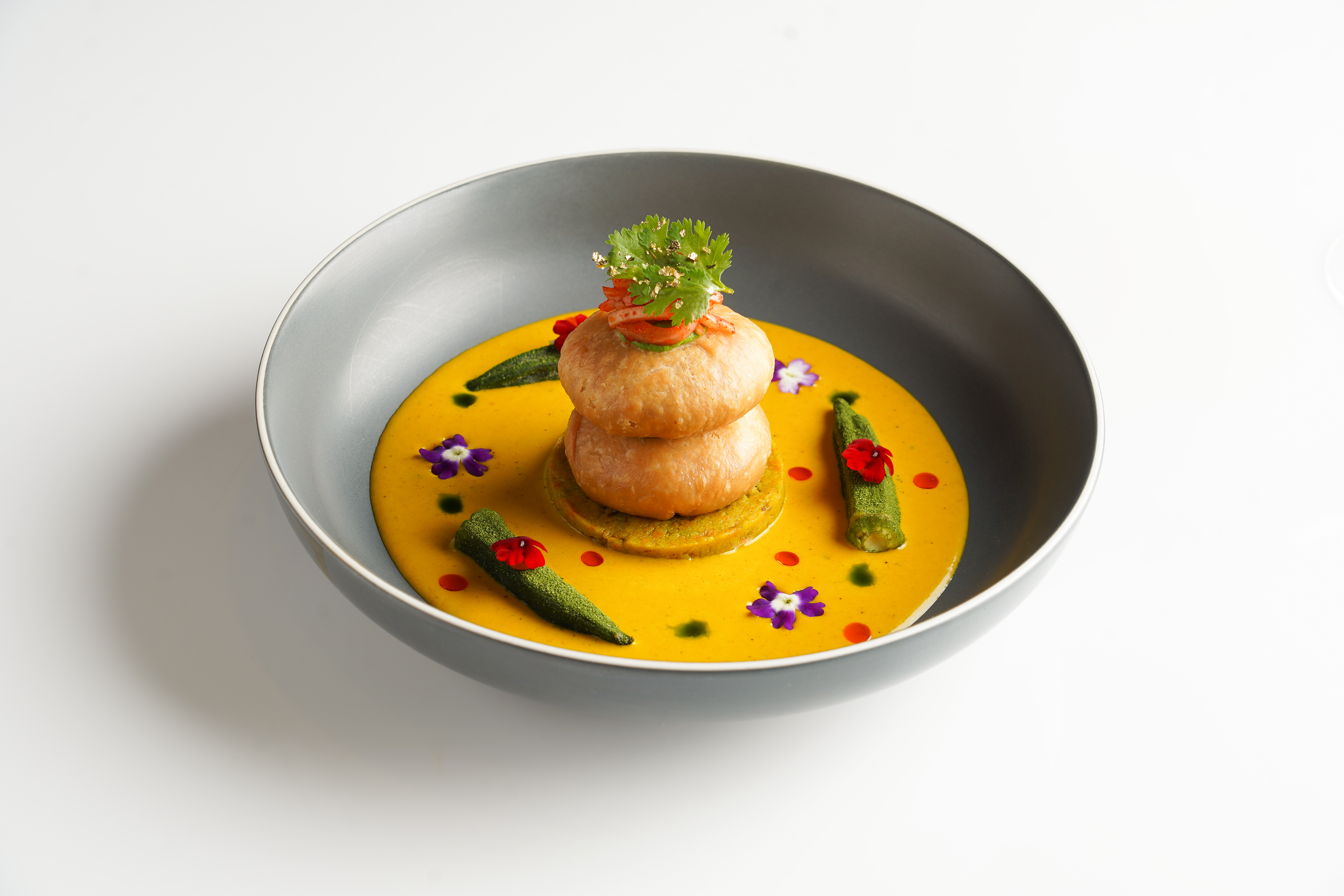 Az ebéd vagy vacsora itt játékos falatokkal indul, például pani puri újraértelmezésekkel, ahol a roppanós burokban savas, fűszeres és friss ízek robbannak össze. Ezt követi a modern chaat torta, garnélarák és spárgasaláta, zeera aloo espuma (egy modern indiai fogás, ami a klasszikus észak-indiai jeera aloo, vagyis a köményes burgonya könnyű, aromás habos – espuma – újragondolása), valamint paradicsom rasam, majd a mélyebb, vajjal és ghee-vel dolgozó klasszikusok, például a prawn ghee roast, utána érkeznek a homár-, kacsa, csirke- vagy bárányfogások. A menü egyik legerősebb pontja, hogy a személyzet nem hagyja lankadni a figyelmet. Szinte minden szósz ott készül a szemünk előtt, hiszen kis kocsin gurítják az asztalhoz az alapanyagokat, és varázsolják a tányérunkra helyben a finomságokat, miközben mesélik a vendégeknek az ételek történetét. A desszertek kifejezetten meglepők: fehér csokoládé és fekete lime sorbet vagy paan ízű vattacukor zárja a sort.