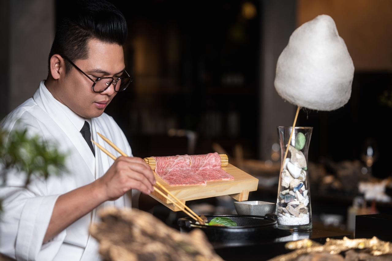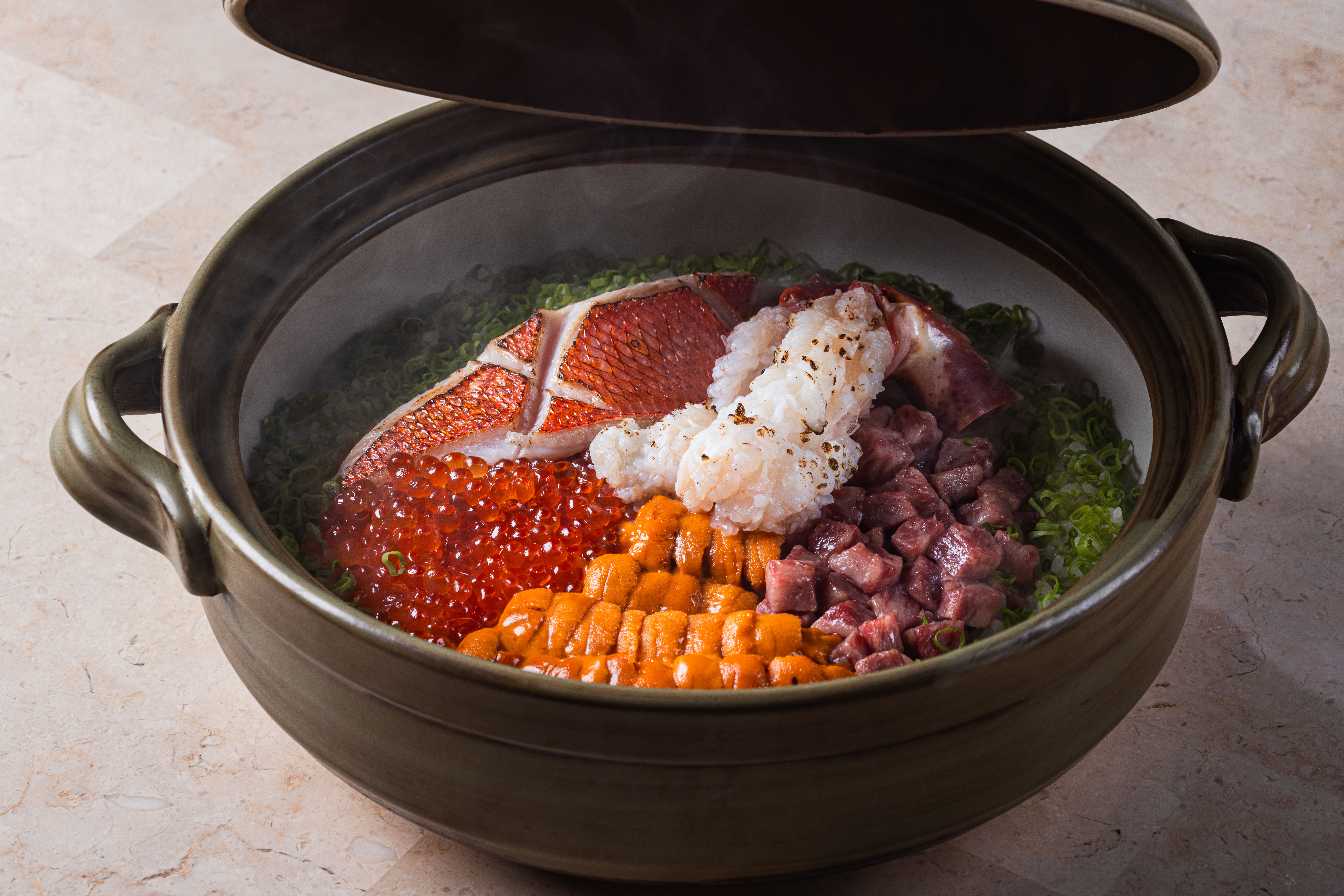 Az egyik különleges menüben (amelynek hivatalos neve Japán első számú Ito wagyu és japán tengeri alapanyagok – exkluzív válogatás) például úgynevezett luxus tál és egy japán amuse-bouche szerepel nyitásként, ezt a séf válogatott sushi-kínálata követi – mondanom sem kell, ezeket mind ott, a szemünk láttára készíti el a séf. Kiemelt fogás a wagyu és kaviár monaka falat, valamint a japán wagyu rántott hússzendvics (mi ilyet pont nem kóstoltunk, de híresen szenzációs a Ken-ben ez is), amely a tradicionális japán ízek komfortos értelmezése. A tengeri kínálatban grillezett királyrák tengeri sünnel (uni) található, a főételek között pedig wagyu steak japán whiskys flambírozással, illetve wagyu shabu-shabu ramen is szerepel. A desszerteknél kókuszfagylalt aranyfüsttel és válogatott desszertválogatás zárja az ételsort.