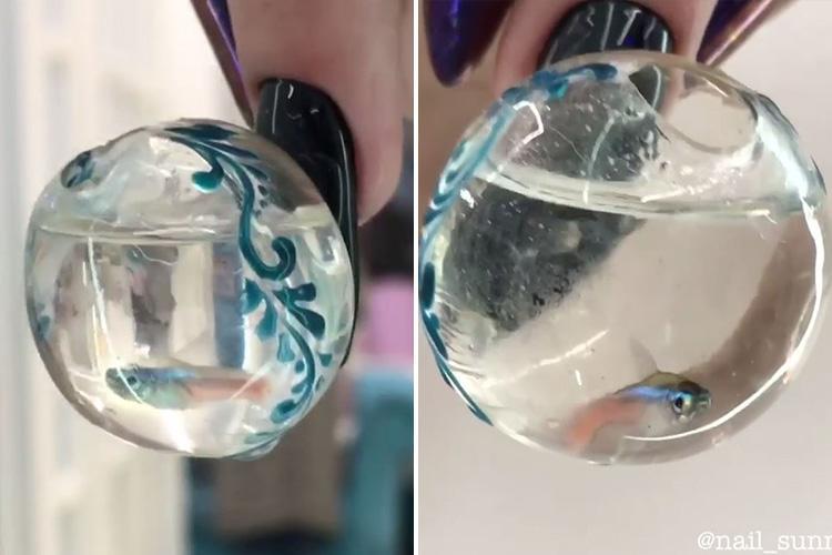 Egy apró gömbakváriumot csináltak körömzseléből, majd feltöltötték némi vízzel, és egy aprócska bébihalat zártak a belsejébe, majd az egészet felragasztották a modell műkörmeire.