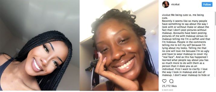 A lány a posztban leírta, hogy sminkben és smink nélkül is szépnek és magabiztosnak érzi magát, és hogy nem érti, miért gyalázzák az emberek, amiért vagy „nem mutatja meg igazi arcát”, vagy „smink alá rejtőzik, annyira ronda”. Victoria azt mondja, smink nélkül is szereti magát, és nem azért festi az arcát, hogy rejtőzködjön, egyszerűen örömöt jelent számára a sminkelés.