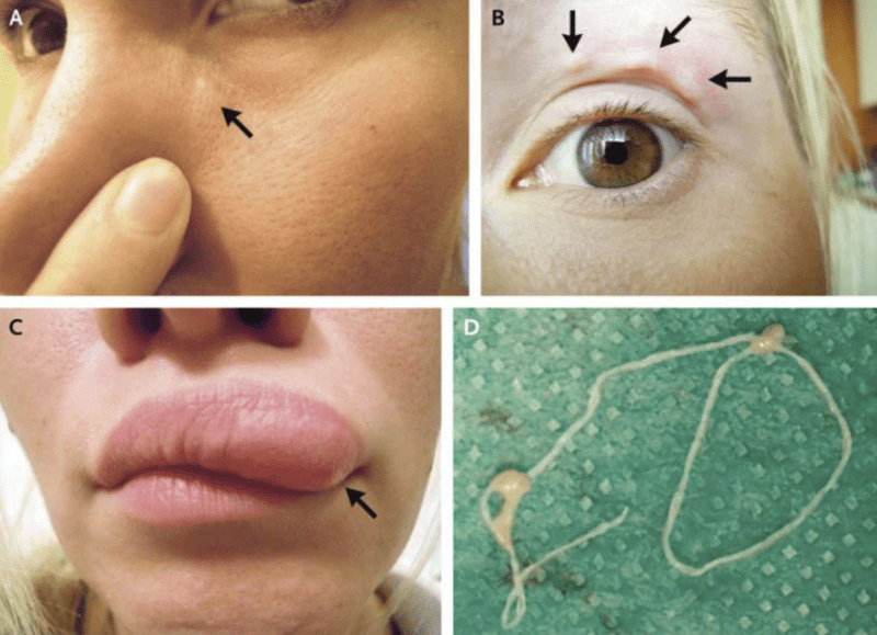 Egy 32 éves orosz nő egy csomót vett észre a bal szeme alatt, majd hamarosan azt is, hogy a csomó elmozdult. Öt nappal később már a szeme fölött volt, tíz nap múlva pedig a szájában.
