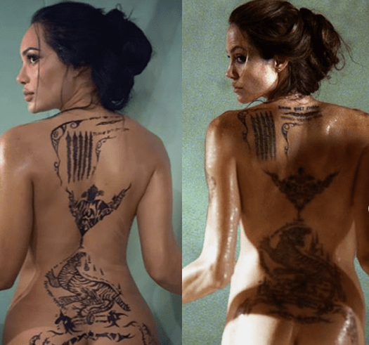 A hasonlóság elképesztő, és nem csak a két tetoválás között, hiszen Andrea egyébként is nagyon hasonlít Angelinára. Másfél millió követővel rendelkező Instánján jó néhány olyan képet láthatunk róla, melyeken a színésznőt utánozza.