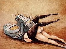 Az ősember barlangjában a „mindent bele” kutyapózzal kezdődött- állítólag. Aztán szép lassan felfedeztük a különböző figurákat, és mire ránk virradt a huszadik század, olyan kifacsart testhelyzetekbe kerültünk, mintha a Laokoón-csoport tagjai volnánk. Majd új kor, új lehetőség. És ismét felcsillant a szemünk. Az újabb játszótárs készen áll. Ember és gép között létesül a következő szexuális viszony. Vajon ki élvezi jobban?