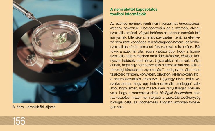 Miután megszüntették a szabad tankönyvválasztás lehetőségét, a biológia tankönyvben szereplő utóbbi – amúgy helytálló – állítás szinte meglepő annak fényében, hogy a kormány a melegellenes törvénnyel megtiltotta a 18 év alattiak számára a homoszexualitás vagy a nemváltás ábrázolását a tömegmédiában, műsorokban, valamint reklámokban.