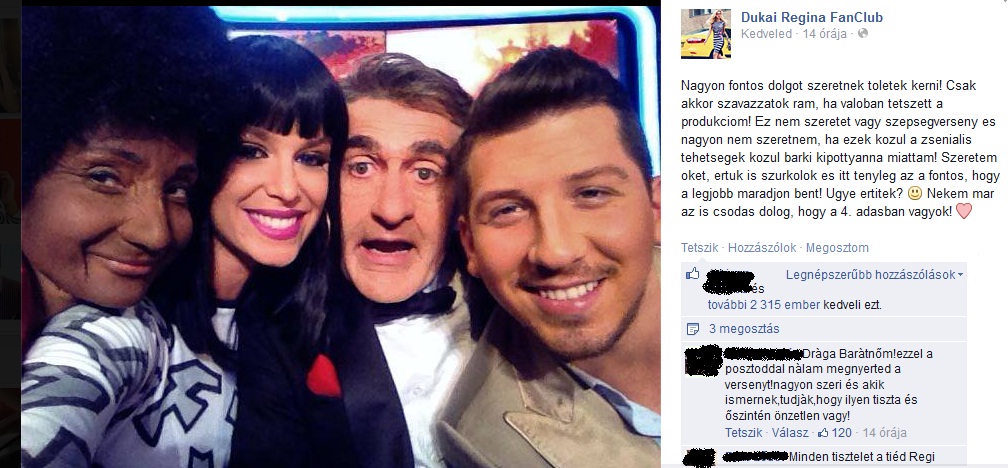 A poszt alá kommentelő rajongók nem értettek egyet Reginával, szerintük igenis jó volt a nagykövetként is helytálló modell előadása. S míg a legtöbben olyan véleményt fogalmaztak meg, hogy Regina nem mindennapi emberségről tett tanúbizonyságot az ominózus bejegyzésével, addig akadtak olyanok is, akik szerint a Sugarbird arcának nincs helye a műsorban. Természetesen megkerestük magát az érintettet, hogy meséljen arról, miért döntött a bejegyzés közzététele mellett: „Nem szeretném, ha a rajongóim elfogultak lennének, és akkor is rám szavaznának, ha egyébként nem tetszett nekik a produkcióm. Nagyon szeretem a versenytársaimat, és úgy gondolom, hogy az a korrekt, ha a követők valakit a teljesítménye alapján jutalmaznak meg egy szavazattal, nem pedig szimplán csak azért, mert kedvelik őt az életben” – nyilatkozta a Nők Lapja Cafénak Dukai Regina, aki ahogy máskor is, úgy tegnap is egyetértett a zsűri kritikájával.