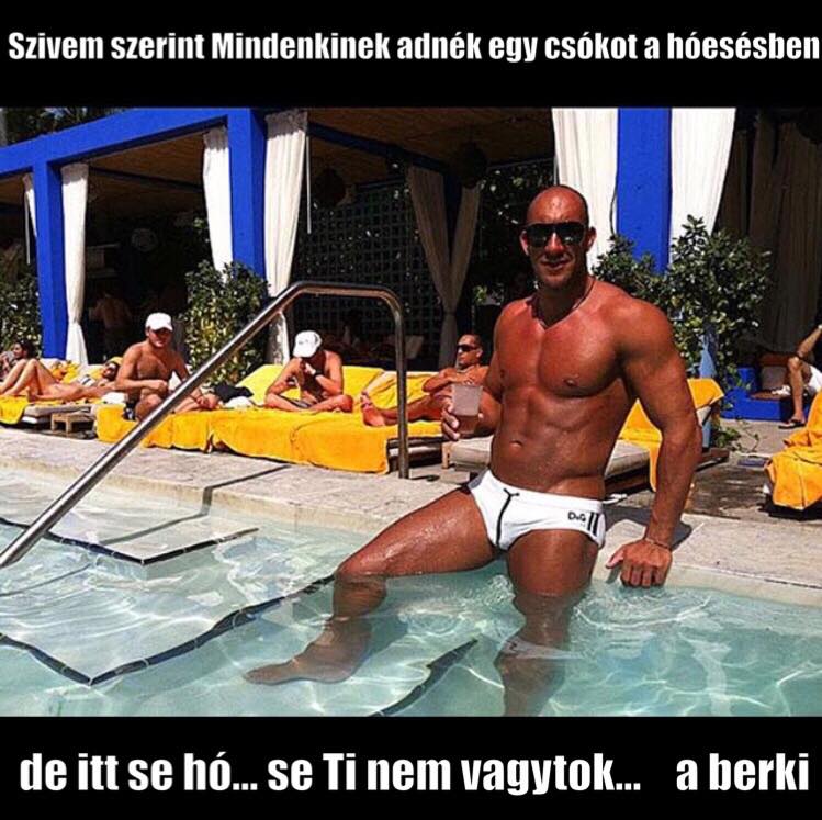 A kárörvendés egyébként nem áll távol tőle. Itt a bronzbarna Berki, tűző napsütésben, a medence széléről küld ironikus üzenetet haza.