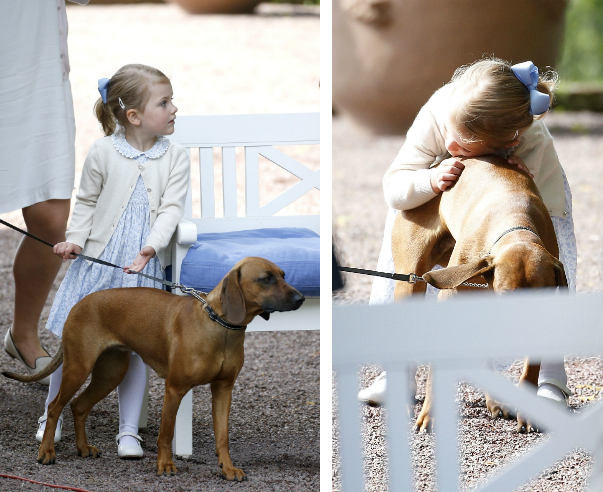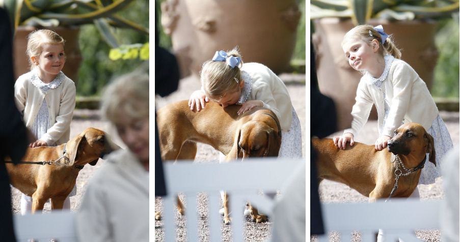 Estelle hercegnő rajong a család kutyájáért, és amíg Viktória a vendégekkel foglalkozott, a kislány a dadájával és a kutyával játszott.