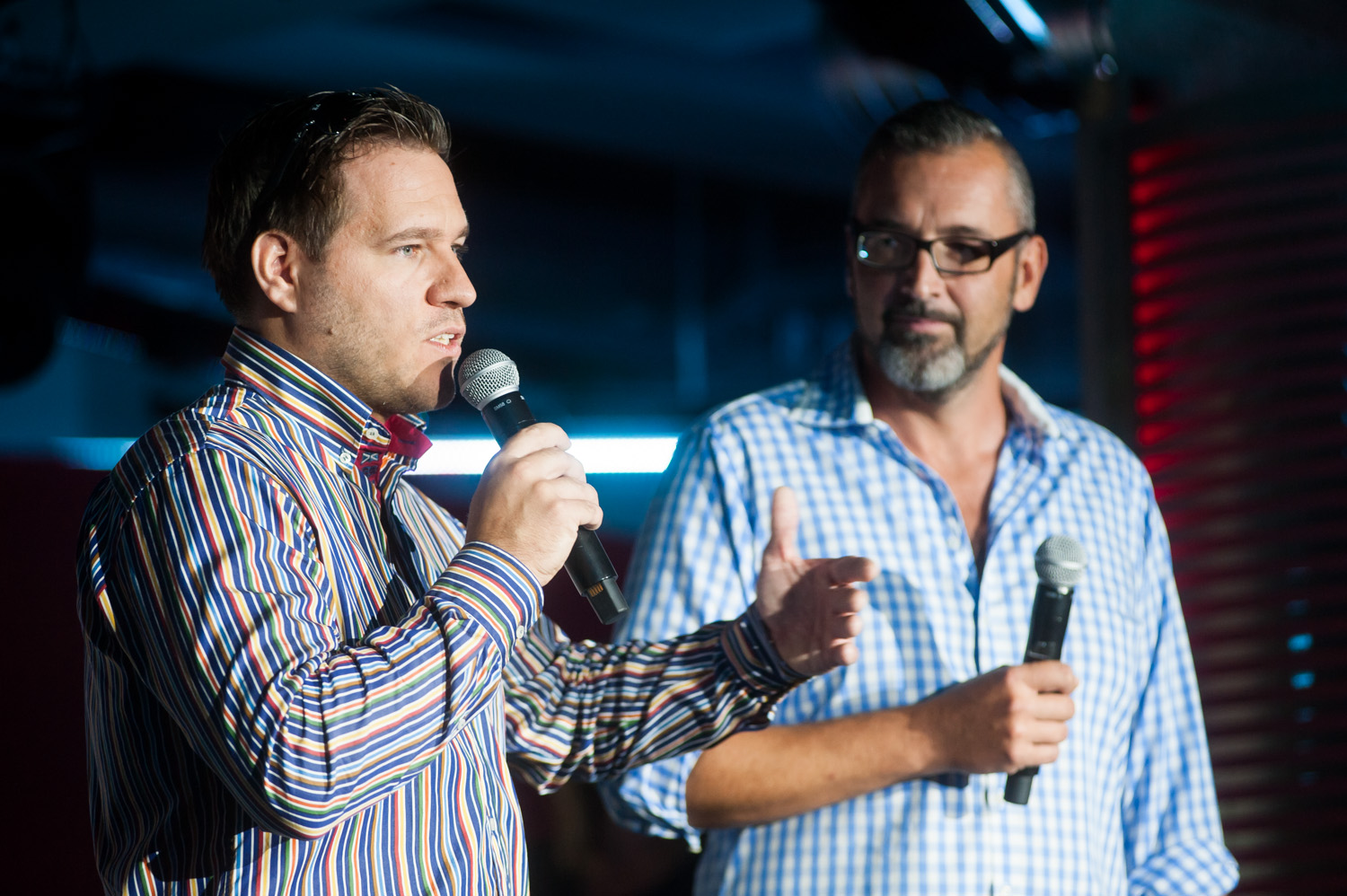 Rákóczi Feri és Széll Tamás a színpadon. Ők lesznek a Milliomos szakács házigazdái. „Volt néhány pozitív pillanat, de rájöttem, hogy a tévézés szempontjából az a jó, ha sok rossz étel készül” – a nap legőszintébb mondatát Széll Tamástól idéztük.