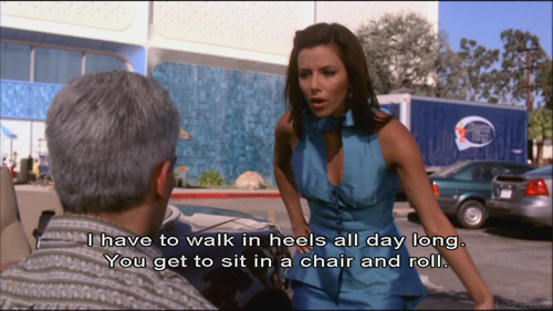 7. Nekem magassarkú cipőben kell járkálnom egész nap, neked meg ülnöd kell egy székben és gurulnod.