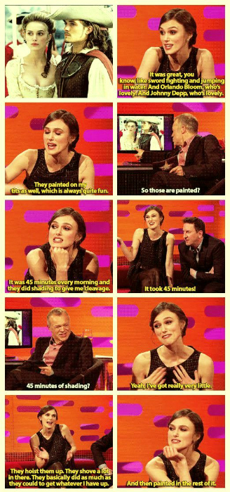 A színésznő a mellmérete miatt korábban szégyenkezett, különösen miután bekerült Hollywoodba. Ennek ellenére nem volt hajlandó mellnagyobbító műtétre, sőt kicsit frusztrálta, amikor a filmek kedvéért nagyobb melleket varázsoltak neki. A Karib-tenger kalózai forgatásán például 45 percet sminkelték, hogy dekoltázst varázsoljanak neki az árnyalással. „Ennyit nem érne nekem minden nap, szerintem dögös vagyok ki mellel is.”