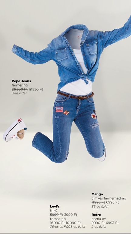 Farmerruházatból rengeteg stílus fellelhető, az anyag vastagságán át a színéig, a koptatásának, esetleges szaggatottságának mértékéig bármilyet választhatunk a Premier Outlet üzleteiben. A Levi’s, Retro, Mustang, Devergo, Replay, Gas, Pepe Jeans és Tom Tailor Denim vezető farmermárkák teljes körű férfi és női ruházati, cipő- és farmerkínálatában széles választék tárul elénk.