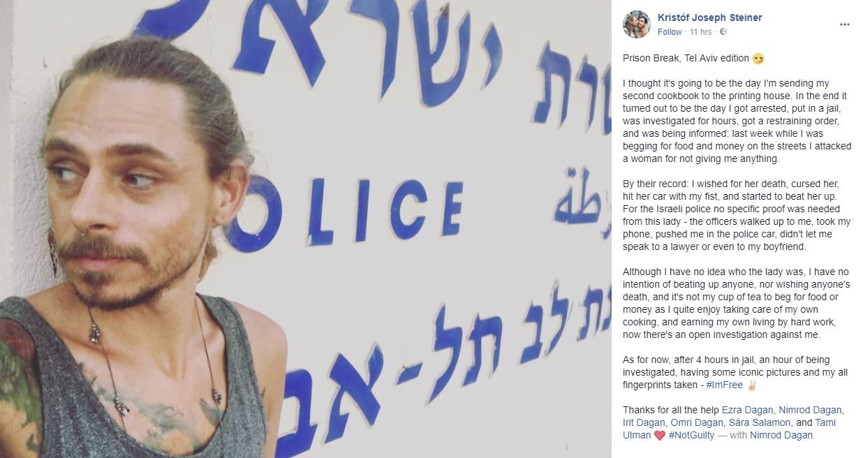 A Facebook-on számolt be rendőrségi kalandjáról az Izraelben élő Steiner Kristóf. A poszt szerint a rendőrök egy nő feljelentése alapján léptek oda hozzá az utcán, elvették a telefonját, rendőrautóba tuszkolták, és letartóztatták.
