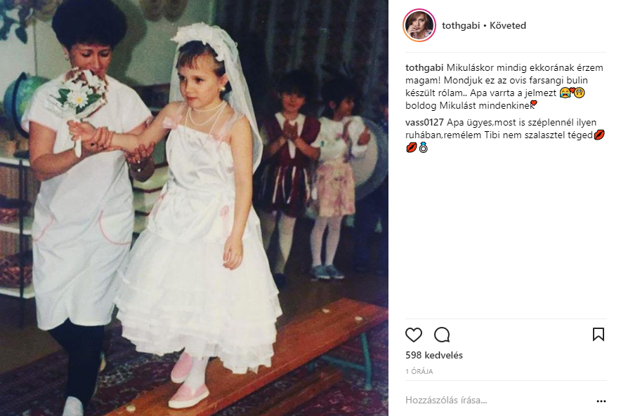 Nem kell megijedni, nem maradtál le semmiről: Tóth Gabi egyelőre nem házasodik, bár már többször is elmondta, hogy örülne, ha találna valakit, aki élete végééig kitart mellette. A Sztárban Sztár + 1 kicsi énekesnője mindig meglepi egy-két finomsággal a rajongóit: most éppen menyasszonyi ruhában pózol, bár jó pár évvel ezelőtt készült a kép. A farsangi szettet édesapja varrta neki, Gabi pedig már akkor is tudta viselni az effajta ruhákat.