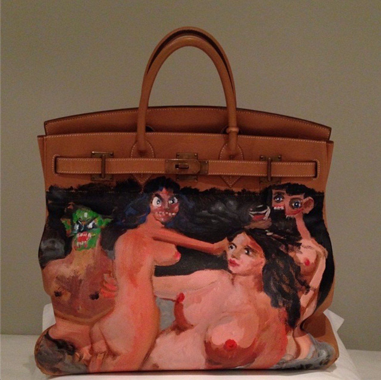 Végre valami, amivel az átlagember is tud azonosulni, igaz? Na azért csak lassan a testtel. Ez a táska nem éppen egy aluljárói, de még csak nem is egy menő üzletből származó konfekciódarab, hanem egy teljesen egyedi műalkotás, amire a neves képzőművész, George Condo festett a saját kezével, természetesen valami egészen kanyésat. Kim Kardashian nem is győzte hashtagekkel, miután előkerült a csoda a West család 2013-as karácsonyfája alól: csak úgy röpködött az Instagramján a sok #KézzelFestettGeorgeCondo meg #KarácsonyiAjándékYeezytől.