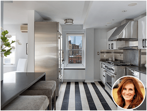 Julia Roberts New York-i, 4,5 millió dolláros lakásában a konyha tágas és nyitott. A rozsdamentes acél felületek és a fekete-fehér padló akár rideg, szürke hangulatú konyhát is eredményezhetne, mégis inkább az az érzésünk, hogy egy otthonos szobában vagyunk.