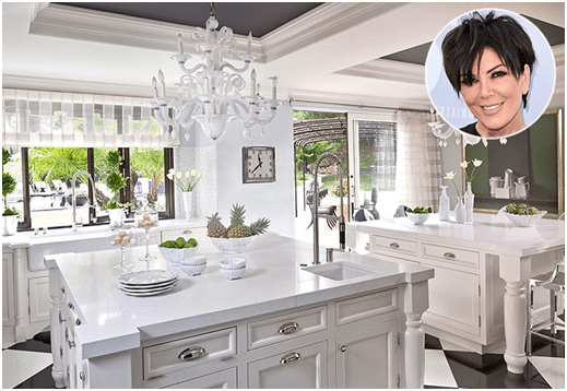 Kris Jenner konyhája pont olyan, ahogy elképzeljük. Modern, de mégis nagyon elegáns, ahol a fehér szín dominál, és két konyhasziget biztosítja, hogy a szakácskönyvíró ínycsiklandó és látványos fogásokat szolgáljon fel nagy családjának. A fekete-fehér nagyméretű mintás járólap és a csillárok kivételes luxushangulatot kölcsönöznek a helyiségnek. És milyen menő az a hatalmas festmény a falon!