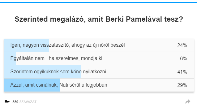 Korábban megszavaztattuk olvasóinkkal, hogy mit gondolnak a vitákról. Szerintetek akkor lenne vége ennek az egésznek, ha Pamela és Berki sem nyilatkozna többet, de arra is sokan szavaztak, hogy leginkább a kis Nati sérül ezáltal.