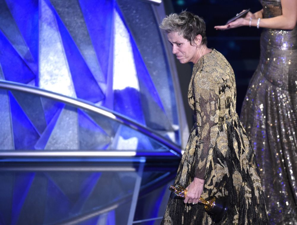 A színpadon még megvolt a szobor. Frances McDormand amerikai színésznő, miután átvette a legjobb női fõszereplő díját az Oscar-gálán a Los Angeles-i Dolby Színházban 2018. március 4-én (Fotó: MTI/AP/Invision/Chris Pizzello)