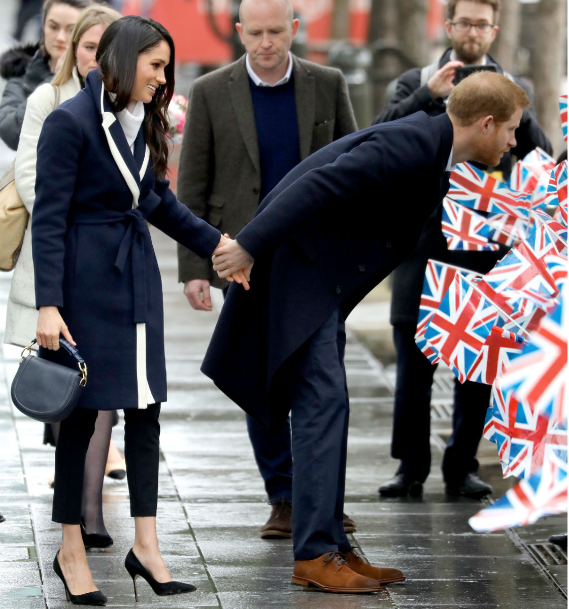 A protokoll szerint először a királyi családba beleszületett fenség fog kezet a rá várókkal, azt követi a házastársa. Azaz hiába férfi Harry, neki kell először kezet fognia, őt követheti Meghan, aki azonban rendszeresen előretolakodik.