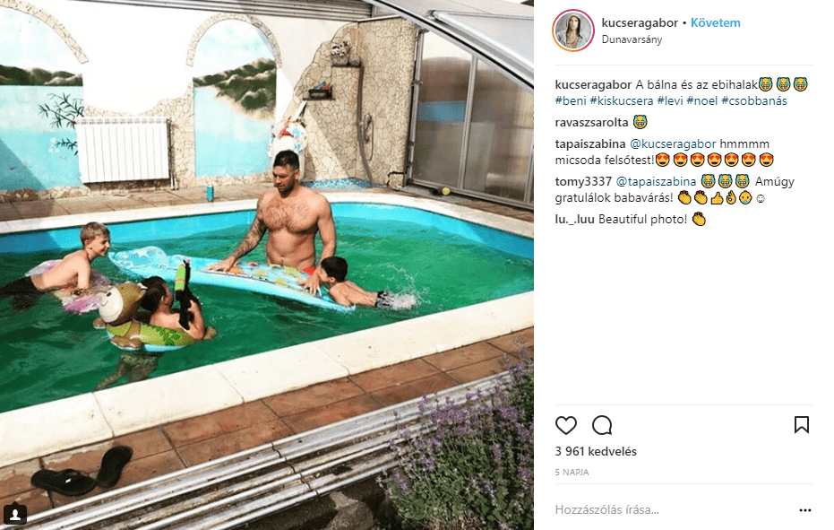 Ezen a fotón már messziről látszik, hogy az „aputest” a múlté. Pedig Kucsera Gábor még egy fehérneműreklámban is szerepelt, hogy megmutassa, ez is tetszik a nőknek. Ennek ellenére lehet, hogy úgy készül az apaságra, hogy lefarag pár kilót a hasáról; majd Tápai Szabina felszedheti.