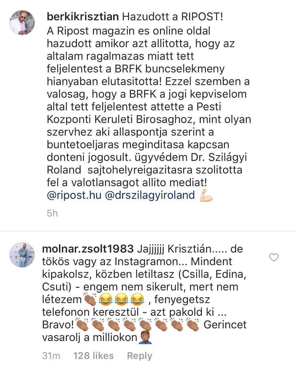 „Egy ideig türelmesek voltunk, nem akartunk ebből bajt, de úgy gondoljuk, Krisztián átvágott mindannyiunkat. Hozzáteszem, korábban már többször csinált ilyet más emberekkel, ezen talán nem kellene meglepődnünk. Azt még elmondanám, hogy ugyanannyi pénze van, mint bárki másnak, hiszen az ő »vagyona« gyakorlatilag a szponzoroktól van. Amikor a luxusautókat kapja a támogatóktól, meghunyászkodik a nagyobb emberek között, bezzeg amikor köztünk, »kisemberek« között van, egyből nagy lesz az arca. Azt hiszi, hogy rajtunk átgázolhat, de nem hagyjuk magunkat” – mondta Megyeri Csilla, aki azt is elárulta, hogy Kulcsár Edináékkal együtt ügyvédhez fordulnak, és bebizonyítják, hogy Berki Krisztián nem az az ember, akinek sokan hiszik