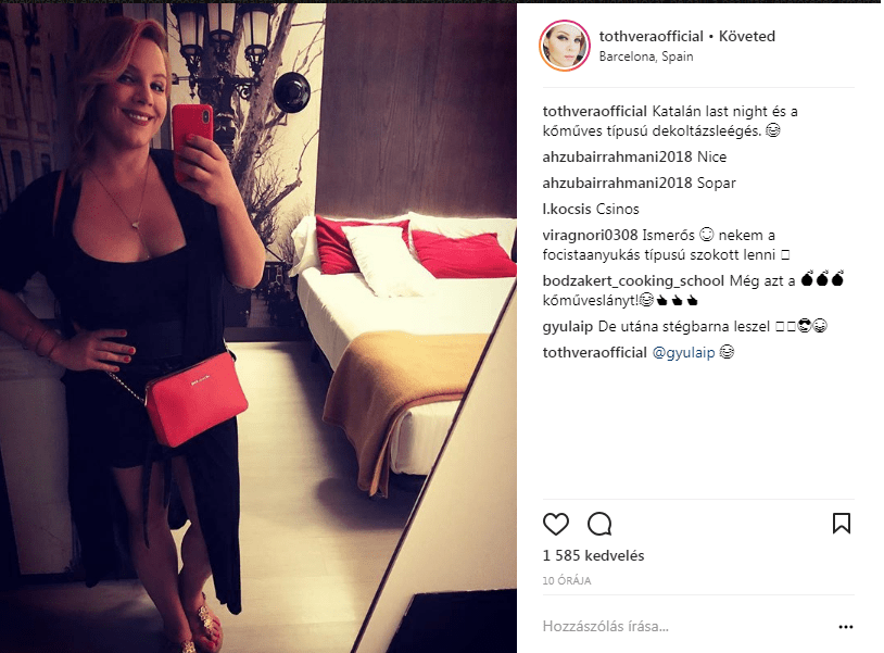 „Katalán last night (utolsó este) és a kőműves típusú dekoltázsleégés” – írta a fotóhoz Tóth Vera, utalva arra, hogy az egész napos városnézésben bizony nem figyelt oda a naptej használatára.