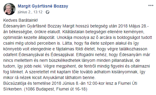 ,,Édesanyám Gyárfásné Bozzay Margit hosszú betegség után 2018. május 28.-án békességbe, örökre elaludt. Kilátástalan betegségei ellenére keményen, optimistán kezelte állapotát. Unokája mosolya az ő arcára is boldogságot tudott csalni még utolsó perceiben is. Látta, hogy fia élete szépen alakul és így könnyebb volt elengednie e fájdalmas földi életet, hogy végre találkozhasson odafent Édesanyjával és Édesapjával. Elfogadni nehéz, hogy Édesanyám már nincs mellettem és nem büszkélkedhetek lányom minden pillanatával, de tudom, így jobb neki. Végre megpihent, de fentről mindig figyelni és oltalmazni fog Minket. A szeretettet mit kaptam tőle tovább adhatom kislányomnak, így mikor rá nézek kicsit Anyukámat láthatom benne” – írta Bozzay Margit fia, aki azt is megosztotta az ismerősökkel, hogy édesanyját június 8-án helyezik örök nyugalomra.