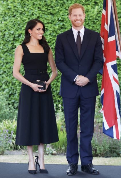 Harry herceg felesége egy sötétzöld Givenchy dresszben érkezett az országba, majd szinte azonnal átöltözött egy pántos, fekete nyári ruhába, mivel kerti partira voltak hivatalosak az angol nagykövet rezidenciáján.