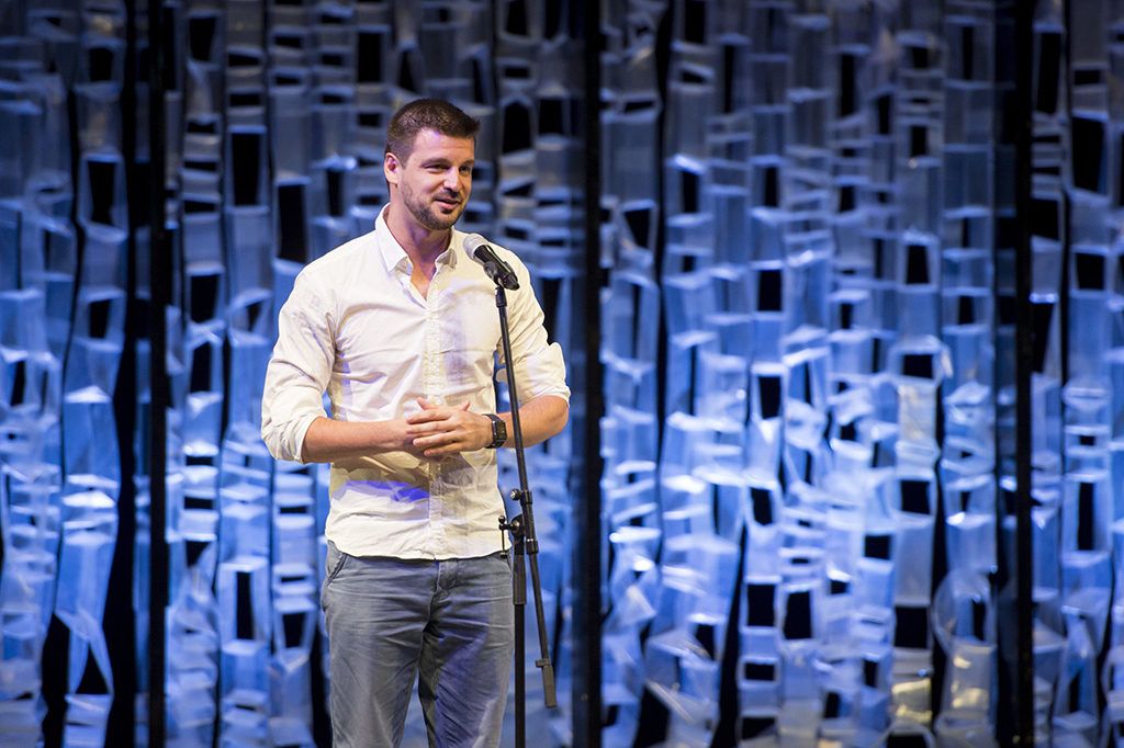 Szatory Dávid, a legjobb férfi szereplő különdíjasa a 16. Pécsi Országos Színházi Találkozó (POSZT) díjátadó gáláján 2016-ban (Fotó: MTI/Sóki Tamás)