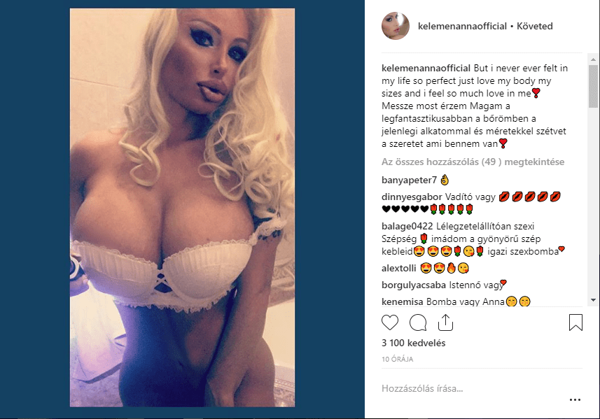 Kelemen Annát fotózták már bugyi nélkül, bugyiban, melltartó nélkül és cicifixben. Egy biztos, a férfi követői odavannak a képeiért, és ennek folyamatosan hangot is adnak. Anna most közelről mutatta meg a kebleit, amiért szintén hálásak voltak a rajongók, rengeteg bókot kapott. Ezenkívül pedig egy vallomást is tett, méghozzá arról, hogy most már tényleg nagyon elégedett magával.