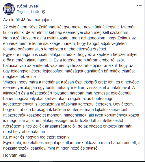 „22 évig éltem Kósz Zoltánnal, két gyermeket neveltünk fel együtt. Ma már külön élünk, de az elmúlt két nap eseményei okán meg kell szólalnom. Nem azért teszem ezt a nyilatkozatot, mert azt gondolom, hogy Zolinak az én védelmemre lenne szüksége, hanem, hogy hangot adjak végtelen felháborodásomnak, s tompítsam a tehetetlenség érzését. Egyelőre magam is csak találgatni tudok, hogy ez a képtelen helyzet milyen erők mentén alakulhatott ki. Ez a történet nem három emberről szól, hatással van az érintettek valamennyi hozzátartozójára, anélkül, hogy az ügy felgöngyölítésére feljogosított hatóságok egyáltalán bármiféle eljárást megkezdtek volna.