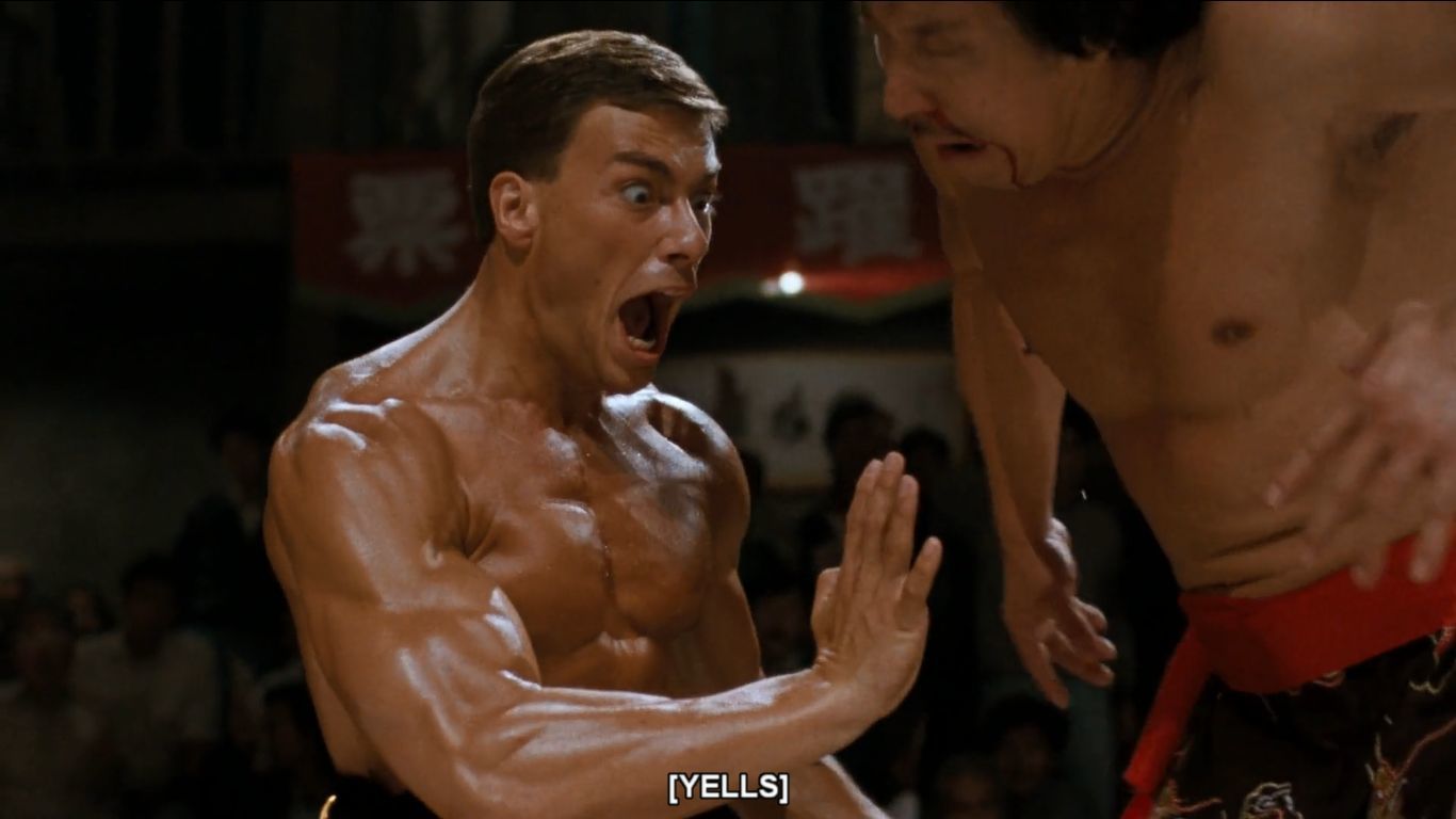 Hősünket, JCVD-t – aki itt a Frank Dux művésznevet viselte – először nem spárgában, hanem pörgőrúgás közben pillanthatjuk meg. Úgy kipattintotta magát, hogy az egyből Muscle & Fitness címlapért kiált.