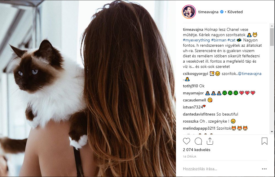 Vajna Tímea ezúttal egy komoly ügy miatt kérte rajongói segítségét. Mint kiderült, kedvenc kisállatát, Chanelt műteni kell, méghozzá a veséjét operálják meg. Andy Vajna felesége a közösségi oldalán kérte minden követőjét, hogy szorítsanak a macskájáért, hiszen ma komoly műtéten esik át.