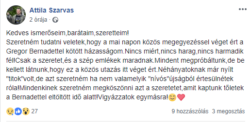 Szeretném tudatni veletek, hogy a mai napon közös megegyezéssel véget ért a Gregor Bernadettel kötött házasságom. Nincs miért,nincs harag, nincs harmadik fél! Csak a szeretet, és a szép emlékek maradnak. Mindent megpróbáltunk, de be kellett látnunk, hogy ez a közös utazás itt véget ért. Néhányotoknak már nyílt „titok”volt, de azt szeretném ha nem valamelyik „nívós”újságból értesülnétek róla! Mindenkinek szeretném megköszönni azt a szeretetet, amit kaptunk tőletek a Bernadettel eltöltött idő alatt! Vigyázzatok egymásra!” – írta Szarvas Attila.