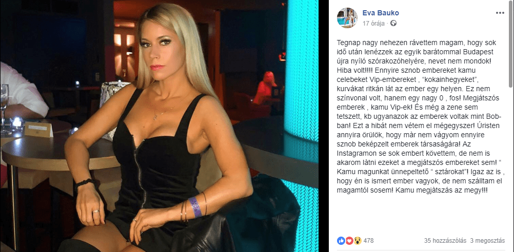Baukó Éva legutóbb azt írta, hogy őt nem a pénz teszi boldoggá, sok emberrel ellentétben. A valóságshow-hős mindig is azt hangsúlyozta, hogy ő nem változott, mióta bement a villába, nem vett fel egy kamu arcot, mint a legtöbb sztár. Most pedig arról nyilatkozott, hogy hosszú idő után ismét elment bulizni, de – enyhén szólva – nem tetszett neki, amit látott.