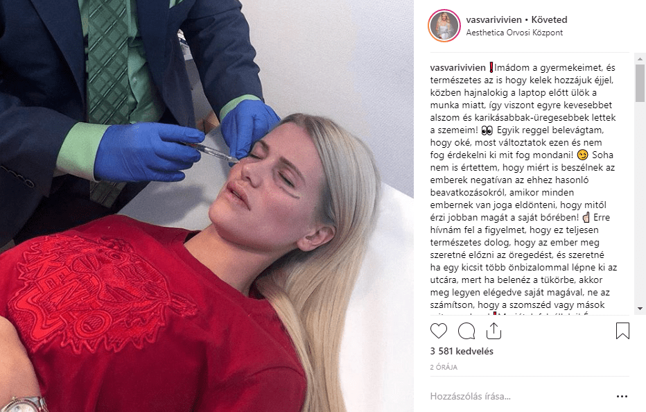 „Arcszépészeti specialista hialuronsavas feltöltést javasolt a szemkörnyéki területre, amire igent is mondtam egyből, hiszen a hialuronsav egy természetes anyag. (…) 15 perc alatt készen is lettem. Másnap reggel megláttam magam a tükörben, és azt mondhatom, hogy életem egyik legjobb döntése volt, sőt, kár, hogy eddig elhúztam” – nyilatkozott a beavatkozásról Vasvári Vivien