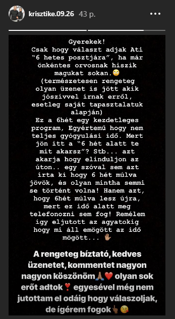 „Csak hogy választ adjak Ati »6 hetes posztjára«, ha már önkéntes orvosnak hiszik magukat sokan. Ez a hat hét egy kezdetleges program, egyértelmű, hogy nem teljes gyógyulási idő. Mert jön itt a »6 hét alatt te mit akarsz« Stb… Azt akarja, hogy elinduljon az úton. Egy szóval sem azt írta ki, hogy 6 hét múlva jövök, és olyan mintha semmi sem történt volna. Hanem azt, hogy 6 hét múlva lesz újra , mert ez idő alatt még telefonozni sem fog. Remélem így eljutott az agyatokig, hogy mi áll emögött az idő mögött” – írta Kriszti a közösségi oldalán.