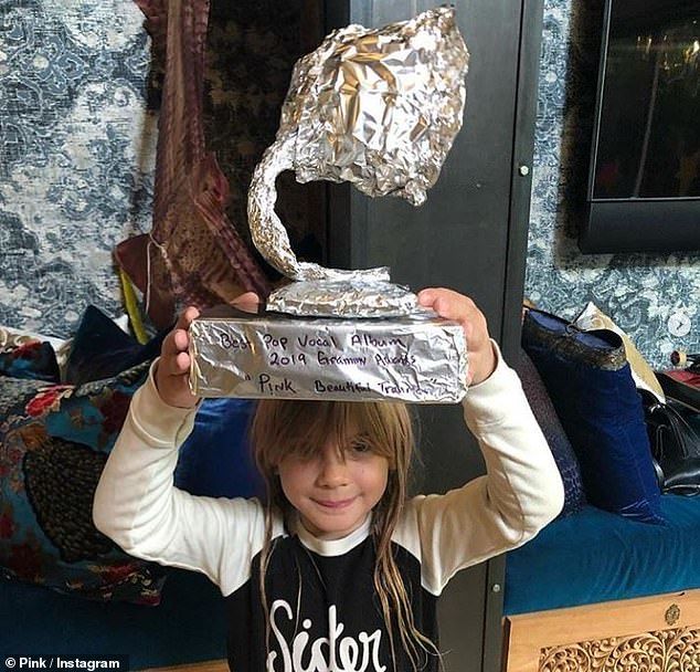 A különleges díjat alufóliából és kartonpapírból készítette Pink hétéves lánya, Willow és kétéves kisöccse, Jameson.