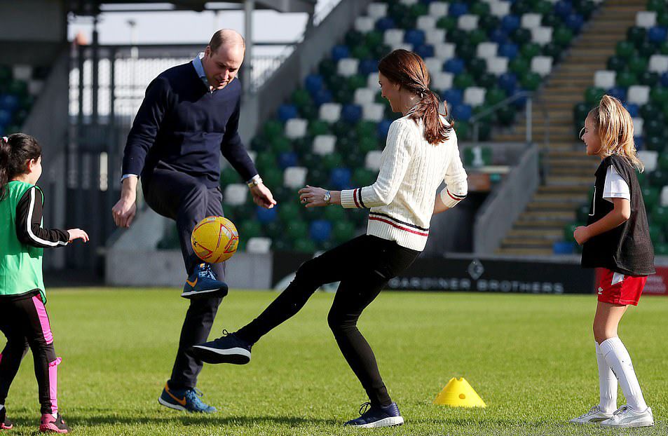 A pár remek hangulatban érkezett meg a belfasti Windsor Park stadionba, hogy passzolgasson egy sort a helyi iskolásokkal. Vilmos, aki nagy futballrajongó hírében áll, még váltócipővel is készült a nagy eseményre.